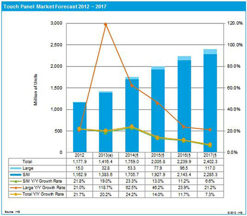 觀察觸摸面板技術別市場,電容式觸控面板在2013年的出貨量將達12.715億台,佔據壓倒性的89.8%的比重,而在2017年預計將增長到23.161億台,占96.4%的比重。